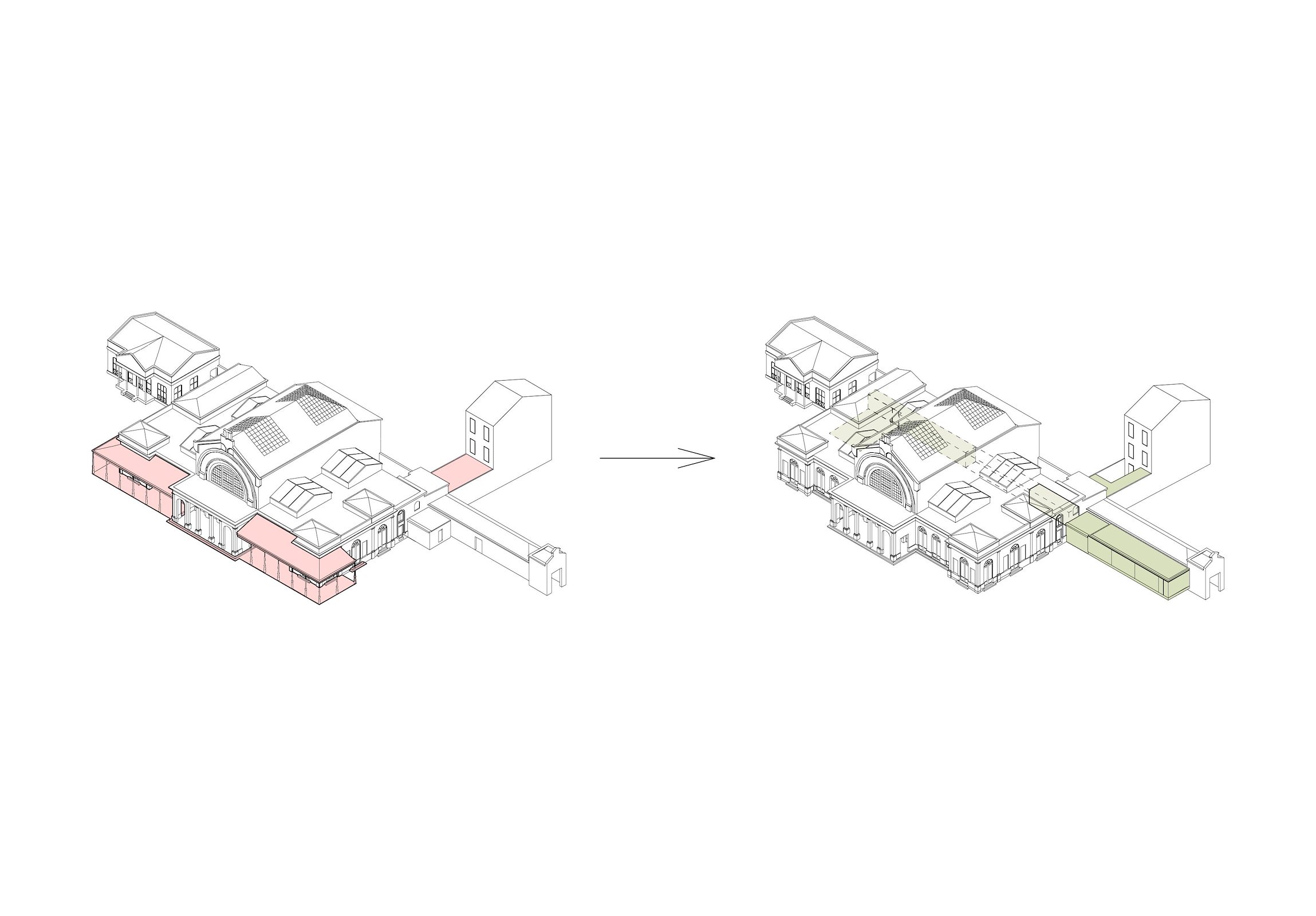 Atelier Kempe Thill en RE-ST hebben met hun restauratie, herinterpretatie en gedeeltelijke abstrahering het ensemble tot een geheel gemaakt. āHet presenteert zich nu als een bijna ideaaltypische architectuur van het geabstraheerde classicisme, zoals het nooit echt heeft bestaanā, stellen de architecten. Met andere woorden, leggen ze uit, volgt de architectuur een creatief, tijdgebonden en deels subjectief model in de lijn van de 19