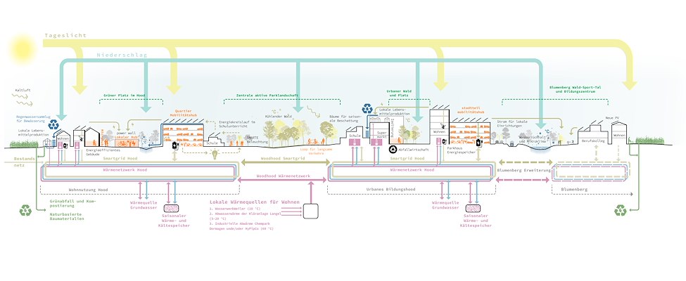“Een belangrijk uitgangspunt is het stimuleren van de gemeenschap, evenals collectieve en gedeelde functies om de privéruimte te minimaliseren en de kwaliteit van de openbare ruimte te verbeteren. De historische landschapsstructuur van bossen en velden is geïntegreerd in WoodHood en maakt ruimte voor zowel actieve en recreatieve programma's. Tegelijkertijd vormen de open groene ruimtes een complex ecosysteem dat dient voor klimaatbescherming, wateropslag, microklimaat en ecologie.”