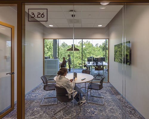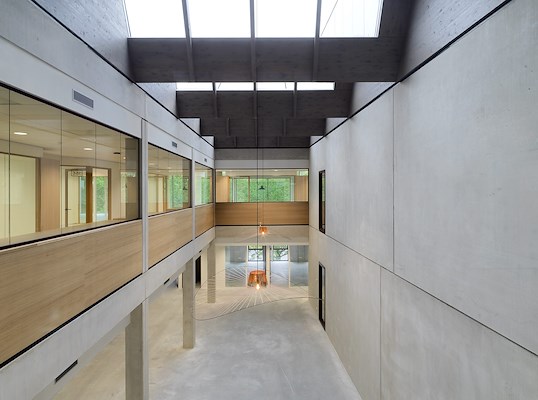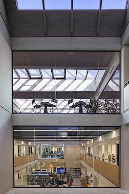 Het volume wordt doorsneden door vier atria die zich elk uitstrekken over twee verdiepingen en zo licht en lucht in het gebouw brengen. Door de atria diagonaal te koppelen ontstaat bovendien overal in het gebouw spannende zichtlijnen naar andere plekken.