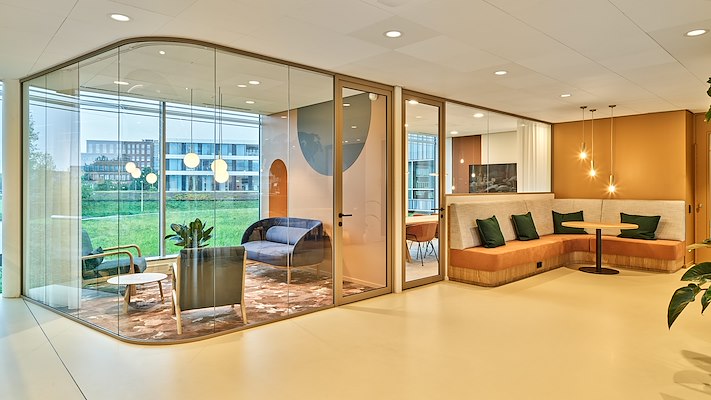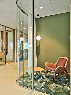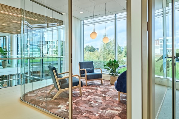 “Met de introductie van het Nieuwe Werken kwamen er naast de formele vergaderruimten ook de informele overlegplekken, waar je kort en op een ander niveau met iemand kunt praten. Het nadeel van dat soort plekken is dat anderen je ook kunnen horen”, legt Leysner uit. “Soms wil je op een wat informelere manier toch een vertrouwelijk gesprek kunnen voeren. Daarom hebben we een ruimte geïntroduceerd met lage stoelen en een koffietafeltje voor een ontspannen sfeer, zonder beeldscherm, maar je kunt er wel de deur dichttrekken. Als een soort lounge met glas er omheen.”
