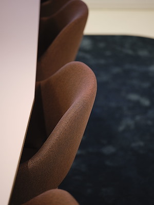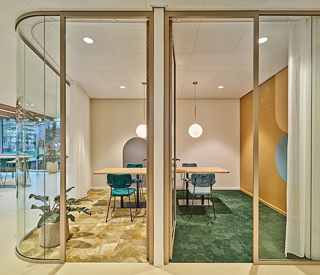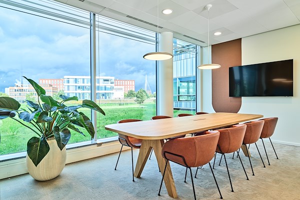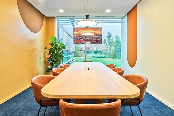 De vergaderruimten zijn, naast de afgeronde hoeken, ook in de plattegrond niet rechthoekig. “Door hoeken niet altijd haaks te maken, krijg je ook interessantere restruimten”, zegt Leysner.