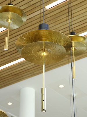 “De golving in het plafond die daardoor is ontstaan voegt dynamiek toe en sluit bovendien aan bij de ronding van de balie eronder”, legt ze uit. “We hebben van de nood een deugd weten te maken. Dat vind ik belangrijk.”