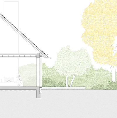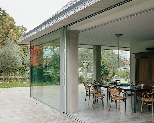 De tuingevel van de woning is volledig verglaasd en kan door de grote schuiframen worden geopend. De aluminium kozijnen zijn op dezelfde hoogte als de betonnen constructieve kolommen geplaatst, zodat er minimale verstoring van het open gevelbeeld ontstaat. Het piramidedak is voorzien van nieuwe grijze leien, die passen binnen de ingetogen kleurstelling van de gehele woning.