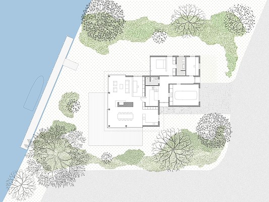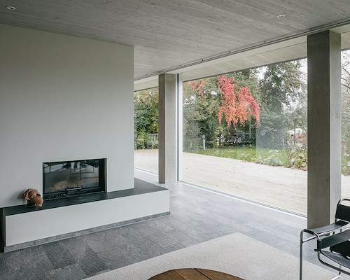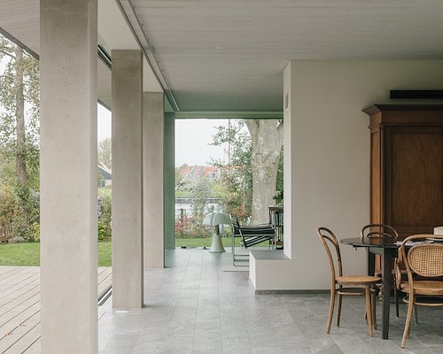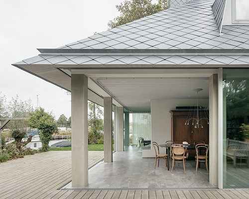 “Zo werden onafgewerkte materialen gebruikt zoals de strakke betonnen kolommen, de vloeiende Noorse kwartsietvloer, het zorgvuldige leien dak en de warme houten vlonders. Deze werden aangevuld met strakke elementen zoals de minimaal gedetailleerde schuiframen, het ronde daklicht en de ongewone dakgoot.”