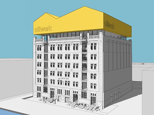 De zesde verdieping huisvest een bar met een geheel glazen gevel en een buitenruimte rondom die wordt gebruikt als terras. Ook komt op deze verdieping een ruimte voor co-working (bestemd voor onder meer freelancers en creatieve ondernemers) met aparte vergaderkamers. In het ‘zwevende’ volume erboven komen zestien shortstay-appartementen met alle een eigen balkon.