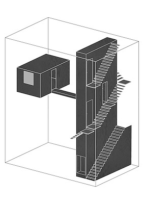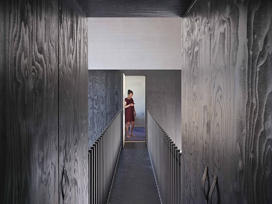 Een meubel op de begane grond bepaalt de ruimte van de B&B. Over de volledige hoogte van de woning strekt het meubel van “een spelonk als trappartij”, leggen de architecten uit. Op de eerste verdieping hangt in de leefruimte met dubbele hoogte een meubel aan het casco; het is bereikbaar via een loopbrug die de ruimte doorkruist. Op de bovenste verdieping bepaalt een slaapmeubel de indeling van de ruimte.