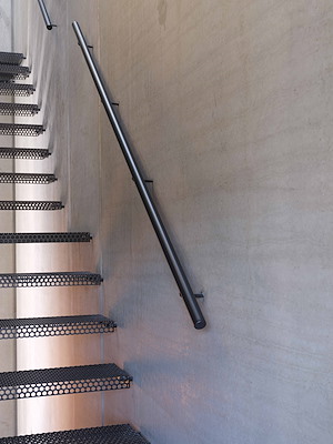 De metalen gevel weert een teveel aan zonlicht uit het interieur en reflecteert het licht naar de omgeving. Achter perforaties in de metalen gevel bevindt zich op de tweede verdieping aan bandraam. Zo blijft de slaapverdieping aangenaam koel. Aan de achterzijde heeft de woning een kleine ommuurde stadstuin, met daarboven een uitkragend terras.