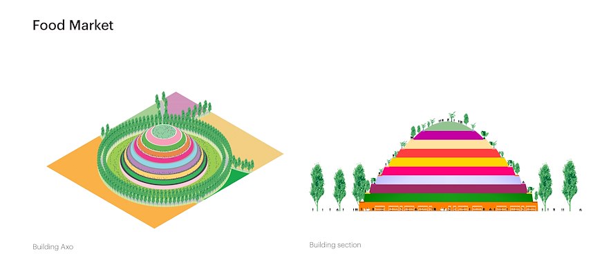 De tuinen vormen een mozaïek waarbinnen diverse voorzieningen het extra aantrekkelijk moeten maken om de Gagarin Vallei te bezoeken of er te wonen. De visie stelt een markthal, een commercieel centrum en een centrum voor de kunsten voor. Ze kunnen worden gecombineerd met een verzonken stadion voor 4.500 bezoekers, legt MVRDV uit.