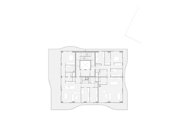 Tussen de woontoren en de twee kantoorgebouwen komt een gemeenschappelijke laag met een collectieve ‘huiskamer’ en daktuin. Het beeldbepalende element van deze laag is het constructieve vakwerk dat de toren draagt.