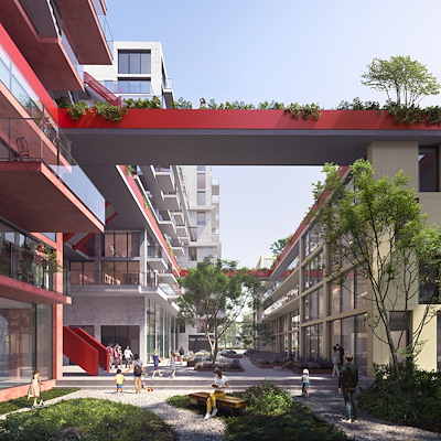 . In plaats van één groot blok met woningen kozen voor de architecten voor vier afzonderlijke ‘woonstructuren’, alle met een eigen identiteit maar verbonden door herkenbare rode galerijen.