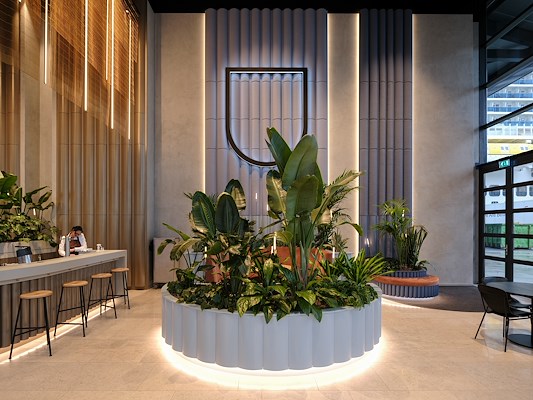 Op de begane grond worden elementaire functies als beveiliging, receptie en lockers afgewisseld met plekken om te werken, vergaderen, ontmoeten en ontspannen. Elementen als de balie, bar en plantenbakken zijn rond of halfrond uitgevoerd, verwijzend naar de halve cirkelvorm van het bouwdeel waarin de lobby is gehuisvest. De bar is ook van buitenaf prominent zichtbaar, dankzij het doorschijnende gordijn met geïntegreerde verlichting dat erboven hangt.