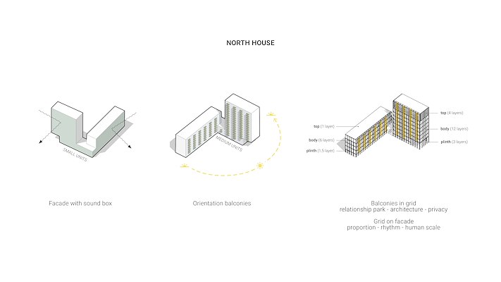De drie blokken zijn alle door een andere partner van OZ ontworpen en hebben een eigen karakter. Zo kenmerkt het eerder opgeleverde East House zich door de trapsgewijze opbouw van het volume en opvallend gekleurde ‘blinde’ gevels die eigenlijk doorschijnend zijn. Het North House vormt met zijn toren en laagbouw een hoekaccent voor de campus, terwijl het West House met zijn gradueel opgebouwde terrasvolume reageert op de naastgelegen kantoorgebouwen.