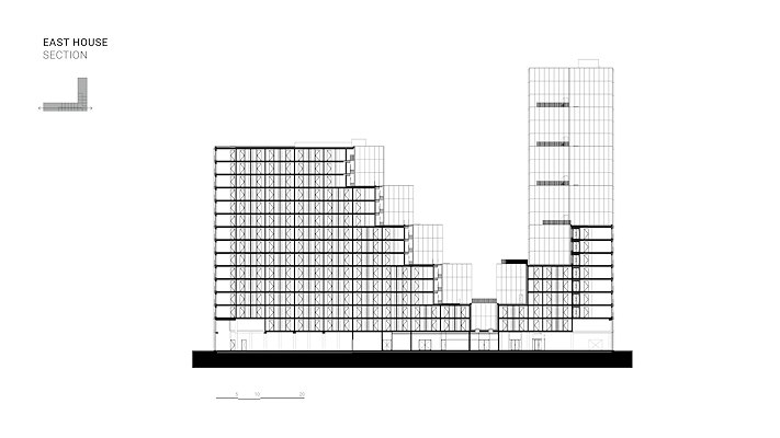 De hoog- en laagbouw van het North House zijn voorzien van een los betonnen grid, met erachter een koperkleurige gevel. De grotere appartementen in dit complex, waarin ook werkruimtes zijn opgenomen, zijn voorzien van balkons. Het West House bevat onder meer gedeelde terrassen voor de bewoners en is gematerialiseerd in metselwerk met daartussen betonnen banden.