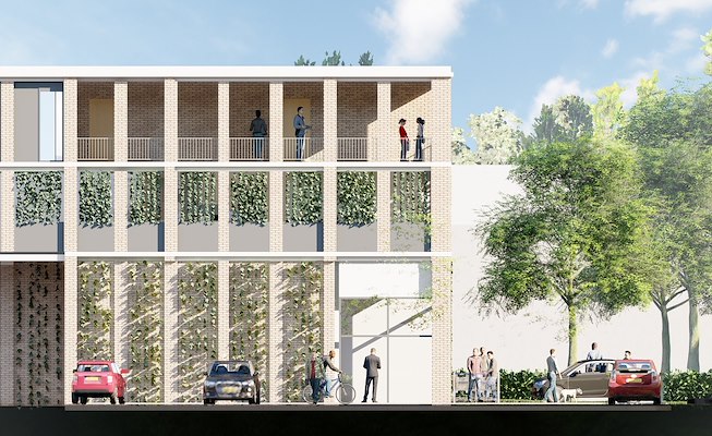 een ontwerp gemaakt voor nieuwbouw aan de Sportlaan in Uithoorn, in combinatie met betaalbare woningen en een kleinschalig zorgconcept. In het ontwerp zijn keuzes gemaakt met het oog op klimaatadaptatie, natuurinclusiviteit en toekomstige aanpasbaarheid van het parkeerdek, meldt het architectenbureau.