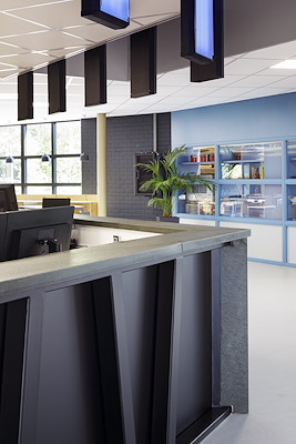 Op een prominente plek in de hal staat de servicebalie, vervaardigd uit hergebruikte materialen. Zo is de ombouw gemaakt van oude balustrades en het blad van traptreden. De led-panelen boven de balie bestaan uit oude tl-armaturen, die door studenten elektrotechniek zijn omgebouwd. Het Living Lab omvat verschillende onderdelen die door studenten zijn gemaakt, zoals de tribune en zitblokken waarvoor een oude gymvloer uit de Groningse vestiging van het ROC de basis vormde.
