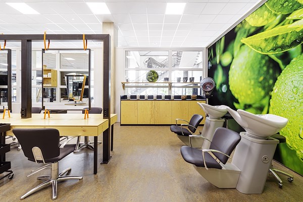 Het Living Lab is het hart van het gebouw, het verbindende element waar iedereen samenkomt, aldus Hollandse Nieuwe. Het omvat verschillende paviljoens waar studenten praktijkervaring kunnen opdoen. Er is een kapsalon, een nagelstudio en een ‘petit café’ waar de verse broodjes, gemaakt door de bakkersopleiding, worden verkocht, legt het architectuur- en interieurbureau uit.