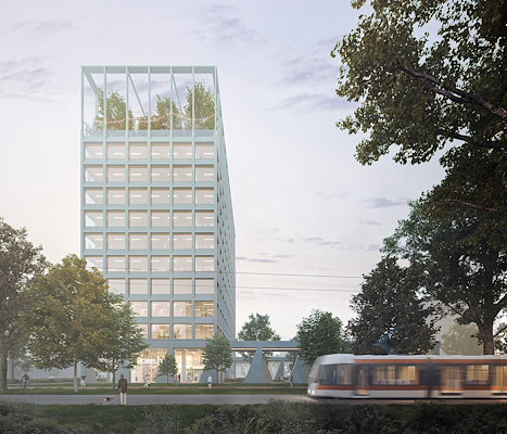 Het nieuwe complex bestaat uit een laagbouwschijf en een toren. De gevel van de laagbouw bestaat uit driehoekige elementen, die behalve een dragende functie zorgen voor een eenduidige uitstraling. De toren krijgt een fijnmazig en open grid, met ertussen riante glaspartijen. De bovenste verdieping biedt plek aan een groene ‘tuinkamer’ met uitzicht rondom.