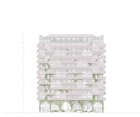 Het gebouw krijgt een betonnen constructie met een flexibele structuur, bestaande uit prefab kolommen en een vlakke vloer. Dit zorgt ervoor dat de woningen, die gemiddeld tachtig vierkante meter groot zijn, kunnen worden aangepast aan de wensen van gezinnen in verschillende levensfases.
