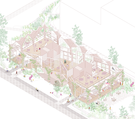 De 7,5 meter hoge plint heeft een open karakter en is ontworpen met veel aandacht voor intuïtieve routing voor kinderen. Het is een open wereld met veel glas en hout en nodigt uit om naar binnen te gaan en overal te zitten en te spelen, meldt VMX. Op verschillende plekken is het mogelijk om te werken of vrienden te ontmoeten. Gemeenschappelijkheid wordt versterkt door bewoners een rol te geven in de invulling en programmering. Om een duurzame en vitale gemeenschap te creëren, is de eerste jaren een kwartiermaker actief.