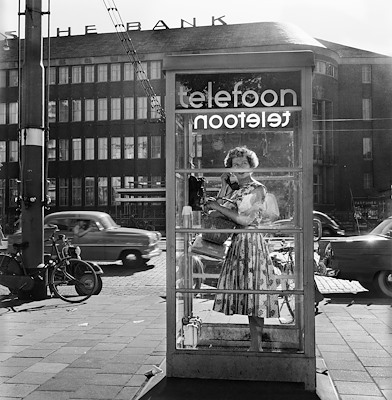 Een vrouw belt in een telefooncel op de Sint-Mariastraat, nabij de splitsing met de Gaffelstraat in het Oude Westen