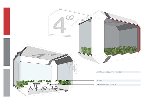 De binnengevel van het atrium wordt onderbroken door zichtbare capsuleachtige ruimten, die kunnen dienen als werk- of vergaderplekken, maar ook als ‘rustzone’. Deze capsules zorgen tevens voor visuele interactie in het atrium en tussen het atrium en de kantoorverdiepingen. Door het dak van het atrium stroomt het daglicht royaal naar binnen.