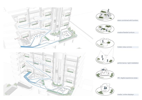Het atrium fungeert als collectieve ruimte in het hart van het gebouw. Het is het ‘podium’ voor de medewerkers van de lagere kantoorvloeren en de opnamestudio’s, alsook voor andere medewerkers en bezoekers, aldus UNStudio. Op de begane grond van het atrium ligt een ‘verborgen’ tuin waar bezoekers kunnen worden ontvangen.