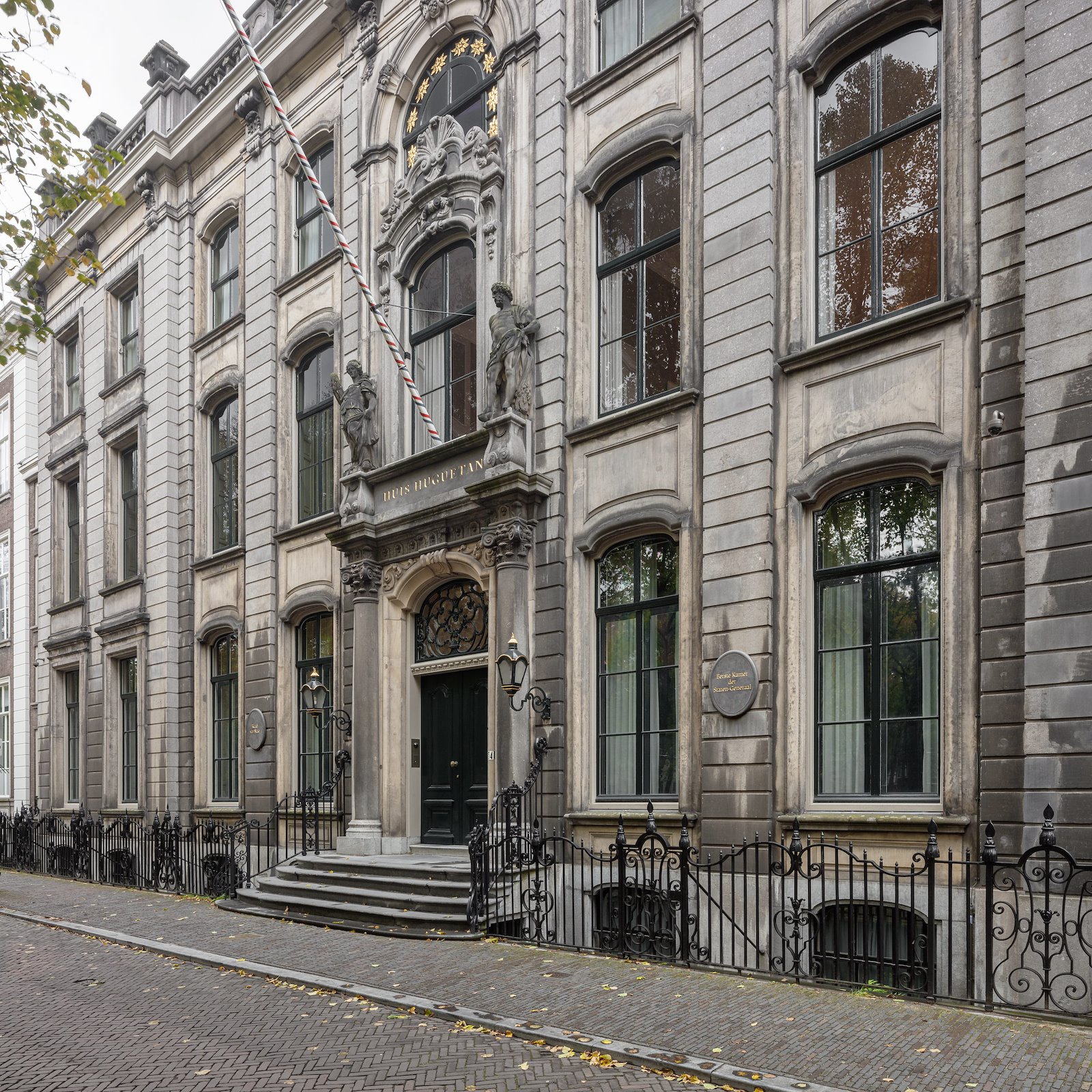 De binnen- en buitenzijde van Huis Huguetan volgen hun eigen wetmatigheid, legt architect Floris Cornelisse van Happel Cornelisse Verhoeven Architecten uit. Met zijn verticaal belijnde, natuurstenen gevel staat het voormalige stadspaleis deftig aan het Lange Voorhout in Den Haag. Maar de stijlkamers binnen volgen maar deels de symmetrische opzet van die gevel – die stijlkamers zijn vooral ook ontwerpen op zich.
