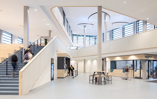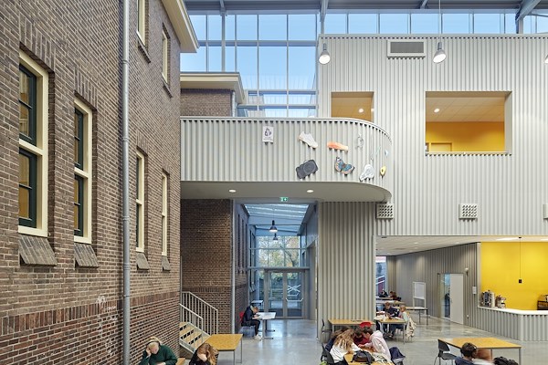 Het gebouw organiseren rond een atrium maakt het compacter. Dit betekent minder buitengevel, wat het gebouw voordeliger te realiseren en bovendien energiezuiniger maakt. Tegelijkertijd kan het centraal gesitueerde atrium worden ingezet om overzicht te scheppen, voor zowel onderwijzend personeel als de leerlingen. Het biedt ook mogelijkheden voor efficiënte ontsluiting van gebouwonderdelen en aparte verkeersstromen voor bijvoorbeeld onder- en bovenbouw, of theorie- en praktijkonderwijs.