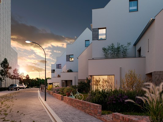 Voor een passende verkaveling heeft Bedaux de Brouwer rijtjes geschakelde woningen ontworpen, waarbij telkens een woning iets naar achteren is geschoven. Dit resulteert in een ‘getrapte’ straatwand. Vervolgens heeft het bureau met zowel vooruitgeschoven erkers en tuinkamers als doorgeschoten daken de woningen met elkaar versmolten.