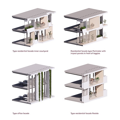 Grote pixelachtige structuren ter hoogte van de kantoorverdiepingen worden verfijnder bij de appartementen. De gevels van de woningen vertonen een verscheidenheid aan texturen, mede door een spel met erkers en loggia’s, die de opbouw van de appartementenmix weerspiegelen. In de gevel is royaal ruimte opgenomen voor groen en dieren.