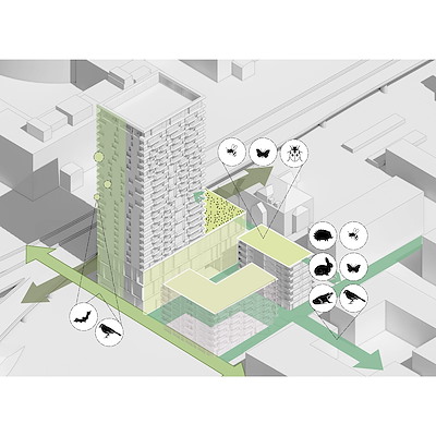 Zowel de draagconstructie als de gevelindeling volgen een strak raster. De modulaire aanpak zorgt voor maximale flexibiliteit voor uitbreiding en gevelontwerp, leggen de architecten uit. Hun voorstel gaat uit van een houten draagconstructie voor de laagbouw; de toren wordt gebouwd met behulp van versterkt prefab gerecycled beton en CO
