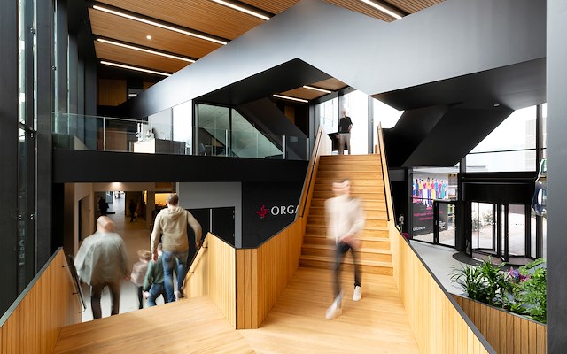 Farmaciebedrijf Organon heeft onlangs zijn kantoorgebouwen ondergebracht in twee naast elkaar staande gebouwen op zijn terrein in Oss. Om beide gebouwen met elkaar te verbinden en een gezamenlijke entree te creëren, ontwierp