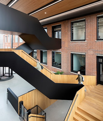 De traptreden en binnenkant van de balustrades zijn van hout, de buitenkant en leuningen zijn met zwart staal bekleed. De hoogstgelegen trap verbindt de derde verdieping van de toren met de tweede verdieping van het carrégebouw. Onderweg biedt hij tot een brede tribunetrap, die afdaalt naar een niveau lager. Daar is ruimte voor een praatje met een collega, maar er kunnen ook grotere bijeenkomsten worden georganiseerd.