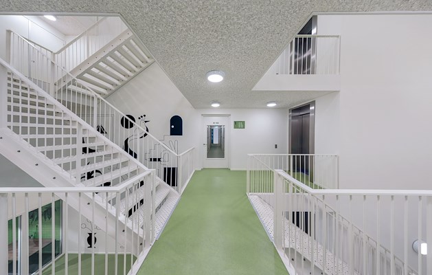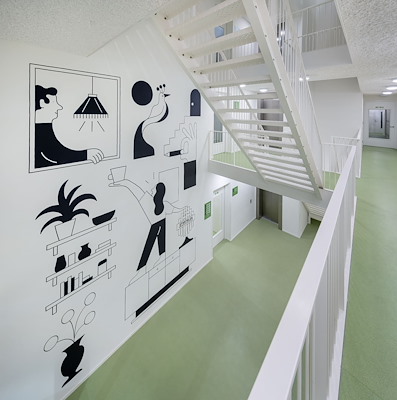 Het blok bestaat uit vijftig woningen voor starters, nog eens vijftig voor statushouders plus een gemeenschappelijke ‘huiskamer’. Het gebouw is voorzien van een opvallend trappenhuis met trappen en bruggen en een muurschildering van beeldend kunstenaar Gino Hoiting. De gedeelde tuin op het zuiden bevat een kas waar bewoners hun eigen voedsel kunnen kweken.