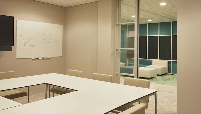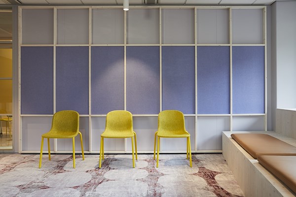 Daarbij heeft het bureau de wanden voorzien van een extra laag in de vorm van vurenhouten frames met gerecycled PET-vilt. Dit heeft zowel de akoestiek als de aankleding van de ruimten veraangenaamd. Ook zijn er gordijnen toegevoegd, die fungeren als extra geluidsbuffer en als flexibele mogelijkheid om ruimten af te scheiden.
