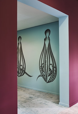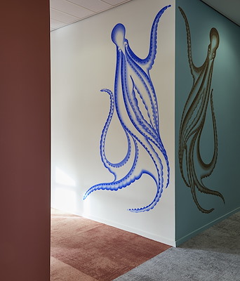 De Amsterdamse kunstenaar Job Wouters is gevraagd om, in samenspraak met de medewerkers van de HvA/UvA, de kernwanden van de verdiepingen te voorzien van kunstwerken. Die moesten passen bij het werk en de identiteit van de gebruikers en de ondersteunende diensten. Op zoek naar een geschikt beeld kwam Wouters uit bij de octopus: “eigenzinnig, creatief en met een heel eigen positie binnen de evolutieleer”, legt Ex Interiors uit.
