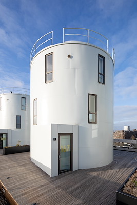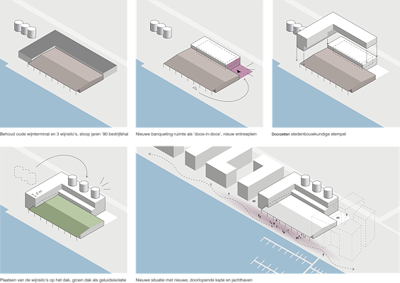 Het restaurant vestigde zich tien jaar geleden in een voormalige wijnterminal uit 1901, een loods van hout en baksteen. LEVS heeft het pand ingepast in een nieuw ensemble met een kloeke, industriële uitstraling. L-vormige nieuwbouw van zes lagen omarmt als het ware de oude wijnterminal en biedt ruimte aan een mix van starterswoningen, gelegen boven een geluidsdichte evenementenzaal. Het betonnen gevelgrid met een invulling van glas en bronskleurig aluminium draagt bij aan de robuuste aanblik van het pand. De parkeerplaatsen voor het project komen in een ondergrondse garage op de aangrenzende kavel.