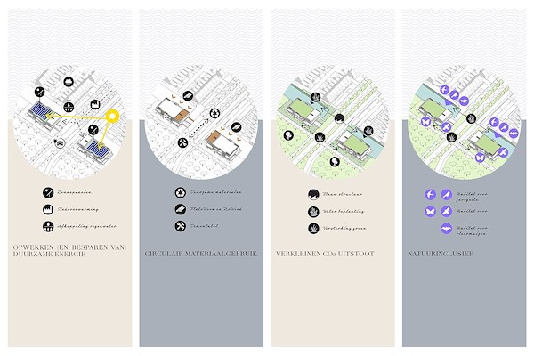 Een deel van het groene dak is voorzien van zonnepanelen, voor de opwekking van eigen energie. Ook de aansluiting op stadsverwarming, opvang van regenwater en gebruik van duurzame materialen versterken de duurzaamheid van het project. In aansluiting op het park worden beide gebouwen ook van het nodige groen voorzien.