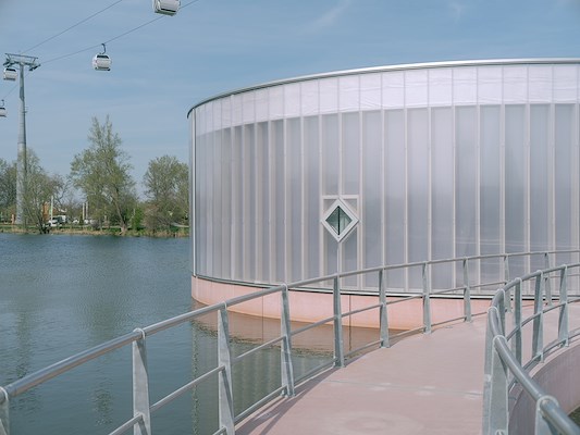 Het Observatorium is een cilindervormig gebouw met een translucente gevel uit lichtgewicht polycarbonaat. Dit zorgt voor een gefilterd zicht van buiten naar binnen en andersom; ’s avonds licht het paviljoen op als een op het water drijvende lampion. Gevelopeningen in het Observatorium zijn afgestemd op de equinox en de zonnewendes.