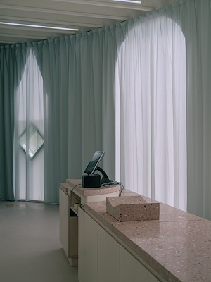 Terwijl het Observatorium door de gevelopeningen een hemelse verbinding legt, is de ring van de Haven juist ‘aards’. Studio Ossidiana ontwikkelde een eigen terrazzo met schelpen en andere materialen uit de (zee)bodem van Flevoland als toeslag.