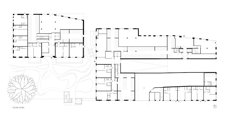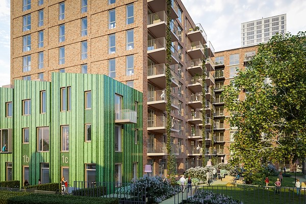 Het groenplan van S&P is opgedeeld in drie ‘landschappen’. Op de hoek van het plan komt een door het ‘barcode’-hek omheinde openbare parktuin rond een bestaande plataan. Een niveau hoger ligt een tuin voor de bewoners, met een glazen kas en genoeg ruimte voor de bewoners om gezamenlijk te gebruiken naar eigen inzicht. Het derde ‘landschap’ loopt met klimplanten langs de gevels omhoog naar sedumdaken waar water wordt opgevangen en vastgehouden.