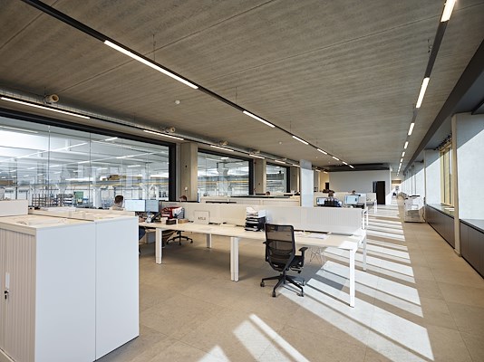 Terug naar het gebouw achter de façade dan, waarvan Arlu samen met architect Wim Embo de lijnen uitzette voor een functionele industriebouw in beton. Voldoende licht, natuurlijke ventilatie en een intuïtief gebouwbeheerssysteem waren belangrijke vereisten van de bouwheer. Niet verwonderlijk met alle kennis op dat vlak in huis via Renson, de groep waar ARLU deel van uitmaakt.