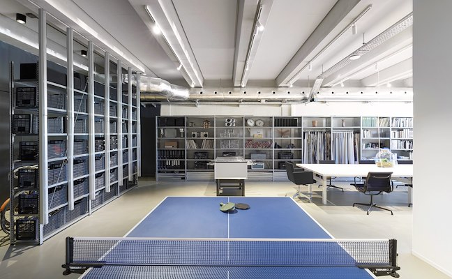 Ook de kastsystemen zijn ontworpen met modulaire onderdelen, die volledig demontabel zijn. De zwarte boutverbindingen zijn door het hele kantoor een herkenbaar element. De wanden zijn onbehandeld gehouden en laten het oorspronkelijke productieproces zien.