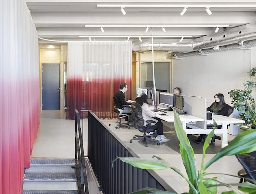 Met gordijnen kan de open werkvloer worden ingedeeld naar de wens van het moment. De gordijnen bieden flexibiliteit in de mate van intimiteit en visuele bescherming en bijvoorbeeld een groepswerktafel afschermen.
