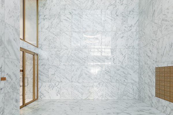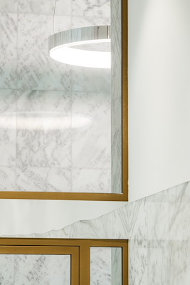Het rasterpatroon van de gevels is geïnspireerd op de sierlijk afgewerkte openingen van de neoclassicistische gebouwen van het Scheepvaartkwartier. Dankzij de roomwitte aluminium bekleding en bronskleurige kozijnen hebben ze tegelijkertijd een hedendaags uiterlijk. Alle raampartijen hebben driedubbele beglazing.