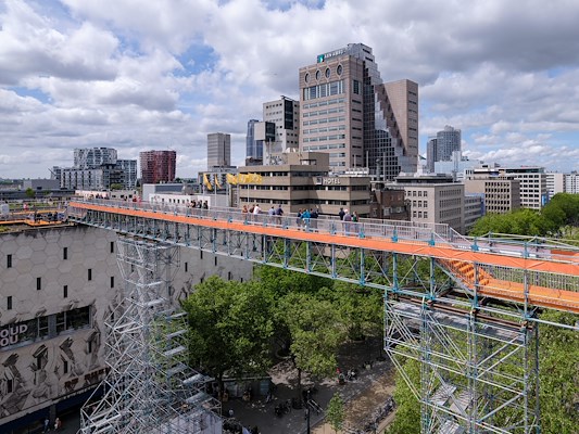 De Rotterdam Rooftop Walk is geopend tot en met 24 juni van 10:00 tot 20:00 uur (de toegang voor volwassenen bedraagt 3,50 euro, kinderen mogen gratis de installatie op). Volgende week opent bij Het Nieuwe Instituut nog een installatie op hoogte die is ontworpen door MVRDV;