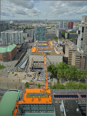 “Tijdens het Eurovisie Songfestival was het plan om een podium op hoogte te maken om de winnaar te eren, maar dat ging vanwege de pandemie niet door”, zegt WIny Maas, medeoprichter van MVRDV. “Ik ben blij dat Rotterdamse Dakendagen dit voor elkaar heeft gekregen, en wil ook nu weer pleiten voor een vervolg: we moeten onze daken niet alleen vergroenen en bevolken, maar ze ook met elkaar verbinden zodat we aan de Rotterdammers een nieuw dakpark kunnen aanbieden. De oranje loper en de overbrugging van de Coolsingel zijn een mooie testcase.”