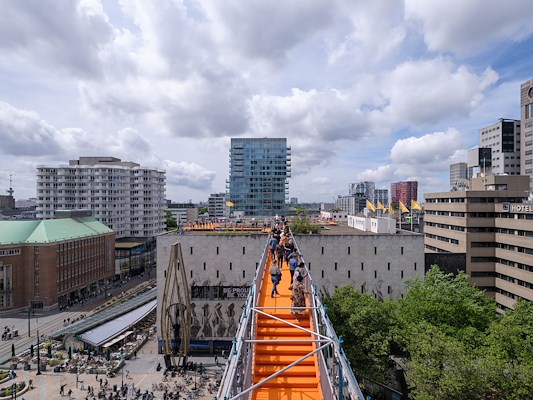 Donderdag is de Rotterdam Rooftop Walk geopend. In het centrum van de Maasstad is een dertig meter hoge installatie met een zeshonderd meter lange ‘oranje loper’ gebouwd die over de daken van verschillende gebouwen voert. Met het projecten willen de organisatie achter de