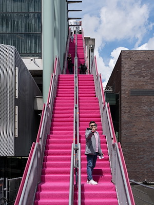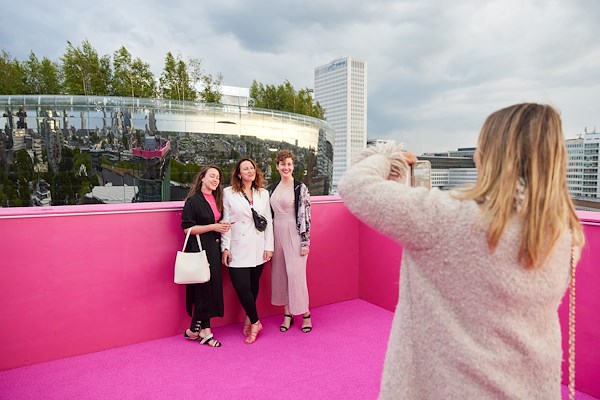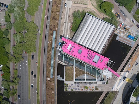 . Op het dak van Het Nieuwe Instituut (HNI) is een beklimbaar en knalroze platform gebouwd dat als festivalhart fungeert tijdens de eveneens vandaag gestarte Rotterdam Architectuur Maand. MVRDV heeft het bouwwerk ontworpen.