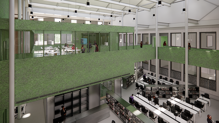 Deze onderdelen zijn vormgegeven als een amorf volume en op de eerste verdieping met elkaar verbonden. In deze omgeving, die zelfstandig werken moet stimuleren en het onderwijsaanbod verrijken, komt ook de buitenwereld naar binnen voor bezoek aan het restaurant, legt het architectenbureau uit.